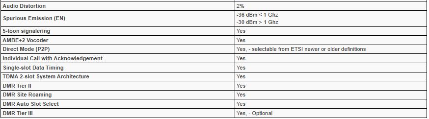- Functionaliteiten: Verschillende functionaliteiten als TDMA-2 sloten, Trunking en DMR Tier 2.